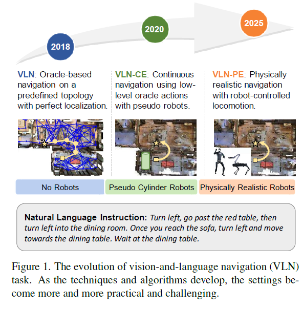 예를들어, 이전 VLN 연구 중 하나는 미리 정의된 그래프 노드 사이를 ‘점프(Teleporting)’하며 이동하는 방식이었는데, 이는 아무래도 노드 사이를 움직인다는 가정으로 접근하다보니 실제 로봇의 연속적인 움직임과는 거리가 멀었습니다.