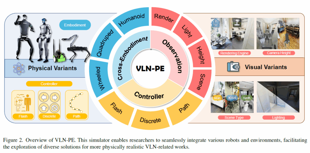 저자들은 이러한 한계를 극복하기 위해 VLN-PE라는 새로운 플랫폼과 벤치마크를 제안합니다. 우선 단순한 애니메이션이 아닌, 물리 엔진(GRUTopia/Isaac Sim)을 기반으로 실제 로봇 역학을 시뮬레이션합니다. 해당 시뮬레이션에서는 휴머노이드(Humanoid), 4족 보행(Quadruped), 바퀴형(Wheeled) 로봇 등 다양한 형태의 로봇을 지원하며, 각각에 맞는 실제 로봇 제어기(Locomotion Controller)를 연동합니다. 그리고 이전 연구들이 많이들 활용한 기존 Matterport3D(MP3D) 환경뿐만 아니라 고품질 합성 장면(Synthetic scenes)과 3D Gaussian Splatting(3DGS)으로 스캔된 현실적인 환경을 통합하여 시각적 다양성을 확보했다고 하네요.