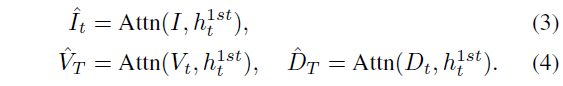 CMA(Cross-Modal-Attention)은 Seq2Seq를 개선한 모델로 언어와 시각 정보 간의 교차 주의(Attention) 메커니즘을 추가하여 명령어와 화면의 연관성을 더 잘 파악하도록 설계되었습니다. 우선 CMA 방법론은 GRU가 2개로 구성이 되어있는데, 첫번째 GRU Unit은 이전 액션 값과 이전 히든 상태, 그리고 이미지와 깊이 임베딩을 토대로 현재 히든 상태 h^{1st}_{t} 를 예측을 합니다. 그리고 이 현재 히든 상태는 아래 수식과 같이 3가지 모달리티에 대한 어텐션을 수행하게 됩니다.