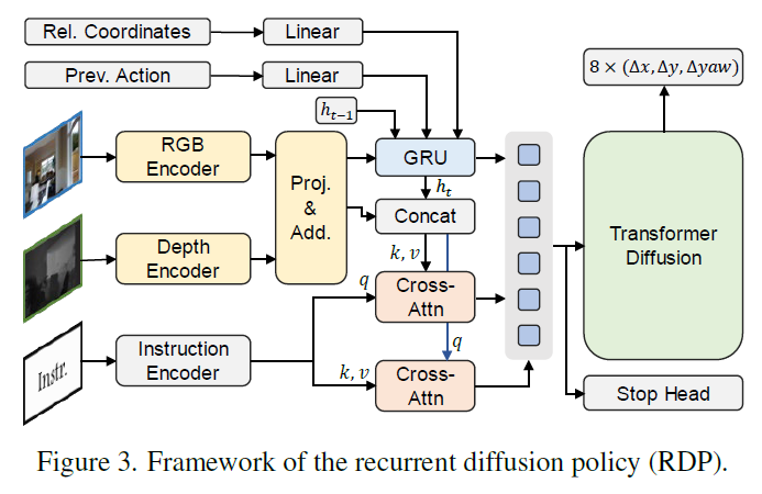 기존 모델들이 ‘전진’, ‘회전’ 같은 이산적인(Discrete) 행동을 선택했다면, RDP는 향후 T_a 스텝 동안의 연속적인 상대 변위와 회전각(\{\Delta x_t, \Delta y_t, \Delta yaw_t\})을 한 번에 예측합니다. 이러한 방식은 촘촘한 웨이포인트(Dense Waypoints)를 생성하여 부드러운 이동을 가능하게 합니다.