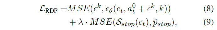 해당 모델의 학습 방식은 DDPM(Denoising Diffusion Probabilistic Models) 방식을 따릅니다. 노이즈가 섞인 행동 데이터로부터 원래의 행동을 복원하는 노이즈 예측 손실(MSE)과, 정지 시점을 예측하는 손실을 결합하여 모델을 최적화하는 것이죠.
