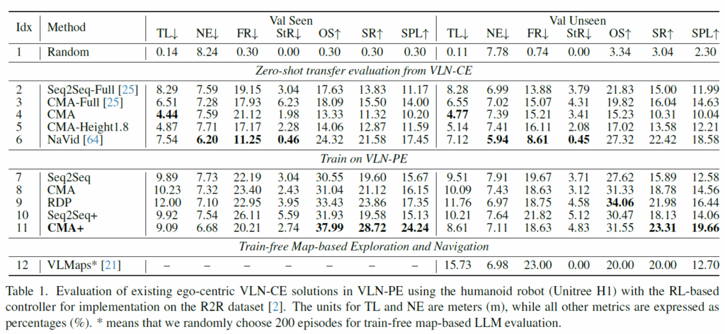 그리고 저자들의 VLN-PE의 가장 큰 특징 중 하나는 시뮬레이션과 실제 로봇 제어 간의 불일치를 최소화했다는 점인데 이를 위해 단순히 로봇을 좌표상으로 이동시키는 것이 아니라, 최신 강화학습(RL) 기반의 이동 정책(Locomotion Policy)을 API 형태로 탑재했습니다. 이는 휴머노이드나 4족 보행 로봇과 같이 복잡한 관절 움직임이 필요한 로봇들에 최적화되어 있다고 하네요.