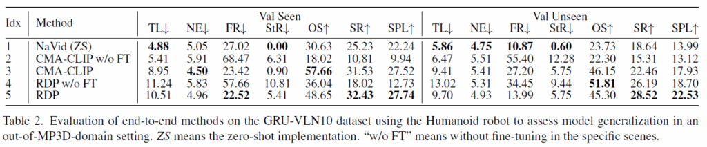 물론 10번과 11번 행과 같이 VLN-CE에서 SOTA 결과를 낸 가중치에 VLN-PE 데이터셋으로 사전학습한 경우 가장 좋은 성능을 보여준다는 점도 참고 바랍니다. 그리고 이산적인 행동 예측 모델 말고도 저자들이 새롭게 제안한? 연속적인 행동 예측 모델 RDP에 대한 성능도 표1에 같이 리포팅되고 있습니다.
