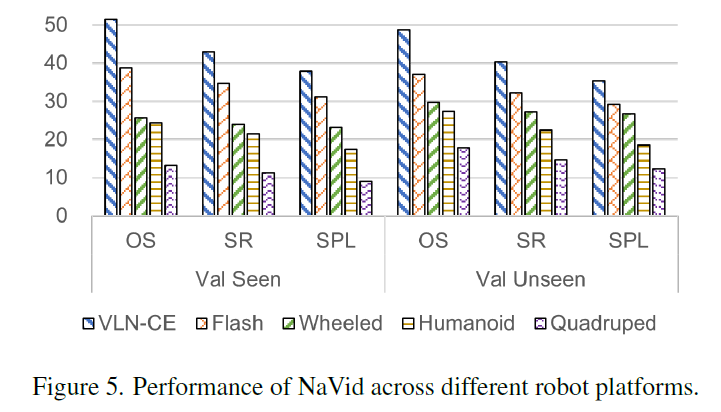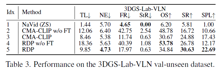 그리고 표3에서 NaVid가 상당히 부정확한 성능을 보여주고 있는데, 저자들은 실제 환경을 3D Gaussian Splatting으로 렌더링할 때 3DGS 특유의 렌더링 노이즈가 거대 모델의 시각적 인식을 방해했을 것이라고 예측합니다.