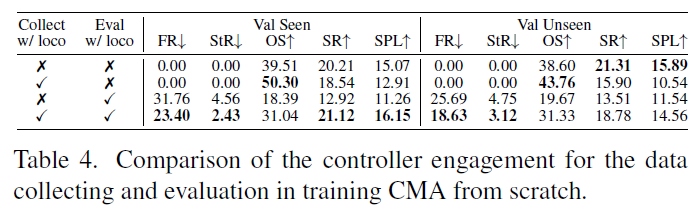 그리고 위에 표 2,3은 저자들이 보다 사실적인 시각 환경을 고려한 평가용 데이터셋 2종류를 제안했다고 했었는데 그에 대한 결과값입니다. 우선 눈여겨보실 점은 새로운 환경의 데이터 441개만으로 작은 모델(CMA-CLIP 등)을 미세 조정했을 때, 거대 모델(NaVid)의 제로샷 성능을 크게 앞질렀습니다. 이는 적은 양의 데이터만으로 학습하는 것도 indomain 상황에서는 충분히 의미있는 결과를 낼 수 있다는 점을 증명합니다.