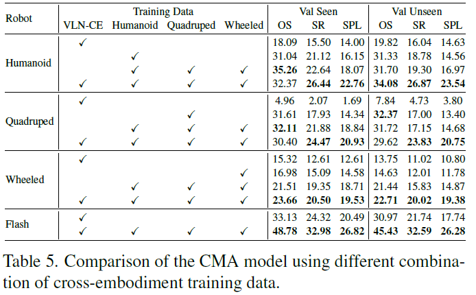 마지막으로, 휴머노이드, 4족 보행, 바퀴형 로봇의 데이터를 모두 섞어서 학습시켰을 때, 단일 로봇 데이터로만 학습했을 때보다 전반적으로 더 우수한 성능을 보였습니다. 저자들은 이것이 단순한 데이터 양의 증가 때문만이 아니라, 다양한 높이와 시점에서 환경을 학습함으로써 모델이 공간을 더 입체적이고 강건하게 이해하게 되었기 때문이라고 분석했습니다.