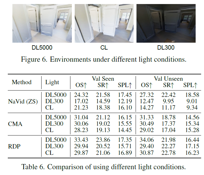 VLN-PE 플랫폼의 렌더링 기능을 활용하여, 완벽한 조명 환경이 아닌 다양한 조명 조건하에서 모델들의 강건성(Robustness)을 평가했습니다. 우선 조도 환경은 DL5000, CL, DL300으로 3가지가 있으며 각각 패널 조명(Disc Light) 강도가 5000인 밝은 주간 환경 (기준점), 로봇에 부착된 조명(전조등)만 사용하는 환경, 그리고 조명 강도가 300으로 매우 어두운 야간 환경을 의미합니다. 여기서 CL의 경우 .정면은 반사광으로 인해 밝지만, 측면은 어두워지는 불균일한 조명 특성을 가진다고 하네요.