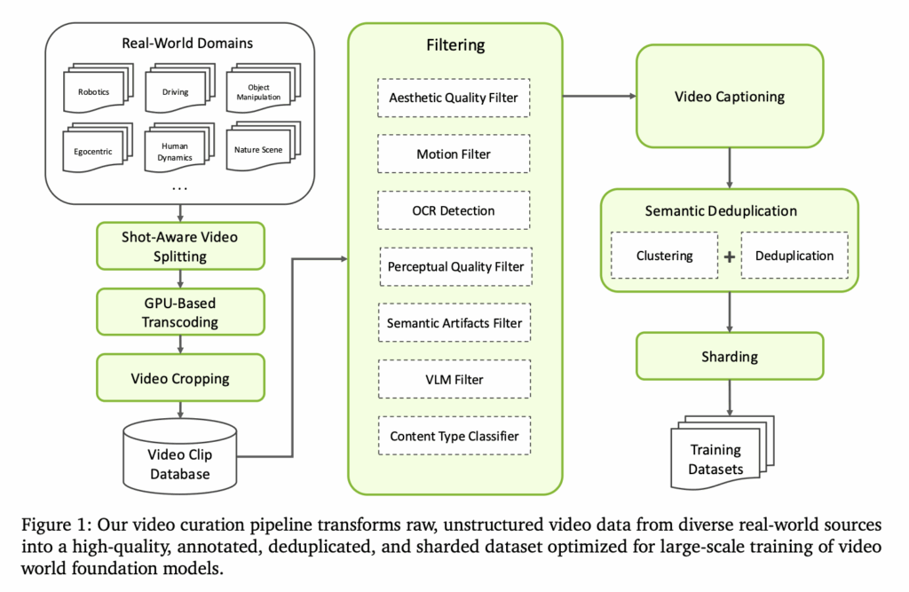 이렇게 모은 60억개의 클립들을 filtering process를 통해 필터링 해줍니다. 필터링 대상은 모션이 일관되지 않거나 시각적 노이즈가 섞인 비디오들이라고 합니다. 시각적인 품질이 떨어지거나, 과도한 텍스트 오버레이, 왜곡된 영상, VLM을 통한 의미가 모호한 영상들과 추가로 비디오게임이나 애니메이션 영상들도 전부 삭제된다고 합니다.