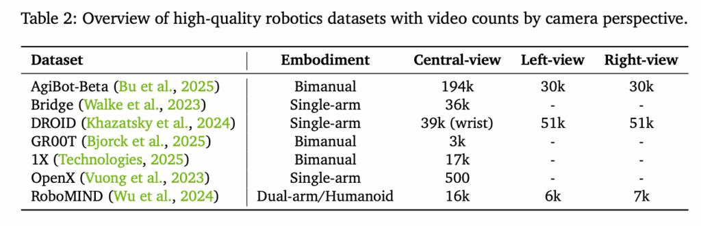 이러한 다단계의 필터를 전부 거치고 살아남은 데이터는 4%정도의 데이터 뿐이라고 하네요.. 역시 모델 학습에는 데이터의 품질이 진짜 중요하다는 것을 느꼈습니다. Cosmos predict 1을 학습할땐 2000만 시간의 비디오 중 30%를 걸러서 사용했는데 이와 비교하면 데이터 자체의 품질이 많이 향상됐을 것 같습니다. VLM 기반의 필터링도 VLM 자체의 발전이 도움을 주었을 것 같습니다. 결론적으로 이러한 데이터 필터링을 통해 더 명확하고 정밀한 supervision이 가능했다고 합니다. 참고로 로보틱스에 특화된 데이터는 아래와 같이 소싱했다고 합니다. VLM 필터링이나 caption을 위한 프롬프팅 시에도 해당 데이터셋들의 메타데이터가 활용되었다고 합니다.