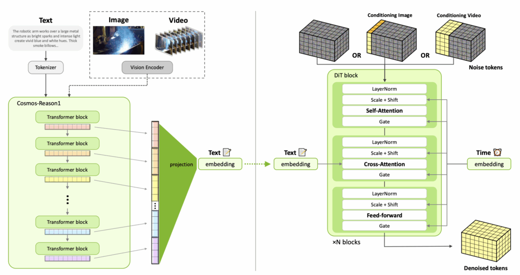 큰 그림을 보면 사용자의 텍스트, 이미지, 또는 비디오를 cosmos reason 1에 태워서 데이터를 뽑아내고 이를 1024차원의 text embedding으로 projection 해줍니다. 이렇게 얻은 text embedding 데이터와 초기 토큰(노이즈 영상)을 가지고 DiT가 영상을 만들어냅니다. Image to video나 video to video를 하는 경우에는 영상의 초반부를 해당 이미지나 비디오로 채워놓고 복원을 진행합니다. 영상 토큰들을 통해 text embedding, 현재 과정이 어떤 시간에 해당하는지를 나타내는 time embedding을 주입시켜 영상을 만듭니다.