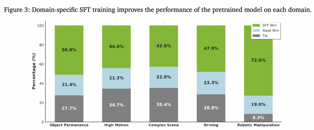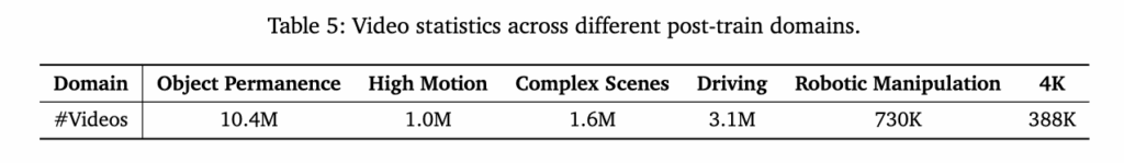 이제 captioning된 데이터들 중에서 의미적으로 비슷한 영상들끼리 모아서 가장 학습에 강력한 신호를 줄 수 있는 영상들만 남기는 semantic clustering과 deduplication 과정을 거칩니다. 이 때는 embedding 기반의 similarity를 활용해 비슷한 영상들을 모으고, 가장 강력한 학습 신호를 줄 수 있는 고해상도 영상들을 위주로 해당 영상과 pairwise 비교를 통해 중복 영상으로 간주되는 영상들은 제거했다고 합니다. 이를 통해 world model에 풍부한 표현력을 제공할 수 있었다고 합니다. 이런 규칙을 통해 incremental 하게 데이터 풀을 넓혀가며 새로운 영상에 대해서도 의미있는 데이터만 추가하는 식으로 데이터가 아무리 커져도 semantic consistency를 유지할 수 있었다고 합니다.