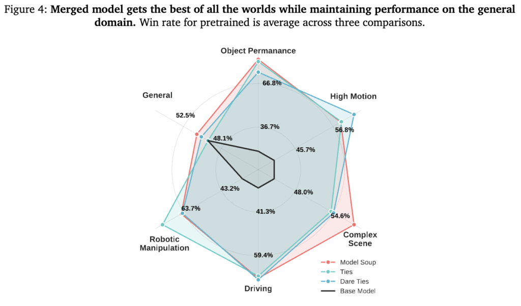 이렇게 기본적인 영상 생성 능력을 갖춘 모델은 table 5의 4K를 제외한 특정 도메인들별로 domain specifit fine-tuning을 거쳤다고 합니다. 하나의 모델이 5가지 도메인을 전부 학습하는것 보다 각 도메인별로 따로 학습시킨 뒤에 파라미터를 하나로 합칠 때 일반화 성능이 좋았다고 합니다. 이렇게 합친 모델을 4k 비디오 데이터셋을 통해 learning rate가 0이 될때까지 계속 finetuning해서 디테일 표현력과 부드러운 움직임을 학습했다고 합니다. (근데 왜 inference 해보면 별로인걸까요..) 아래 figure 3을 보면사람이 봤을 때 각 도메인 별로 finetuning 한 모델들이 base 모델보다 선호도가 높은것을 알 수 있습니다. 연두색이 finetuning 모델이 잘한다, 하늘색이 베이스 모델이 잘한다, 회색은 비슷하다 입니다. 특히 robotic manipulation에서 성능이 두드러지게 개선된 것을 볼 수 있습니다. Figure 4는 finetuning한 모델들을 합친 soup model을 평가한건데 robotic manipulation에서 별 차이가 없다는 평가가 많은 것을 볼 수 있습니다. 진짜 워낙 별난 도메인인거 같습니다,,, 허허