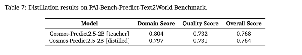 마지막으로는 영상 생성 속도 개선을 위한 Distillation이 진행됐다고 합니다. 내용이 워낙 어려워서,, 큰 틀에서 제가 직관적으로 이해된 부분만 담자면 모델이 정답을 찾아가는 지름길을 타면서도 시간적인 일관성을 유지하도록 학습했고 추가적으로 계산 부분에서도 cosmos predict 2.5만을 위한 flash attention과 병렬 처리 기술을 구현했다고 합니다. 이 결과 아래와 같이 기존의 수십 step과 비교했을 때 4step만으로 끝낸 영상의 퀄리티가 비슷한것을 볼 수 있습니다.