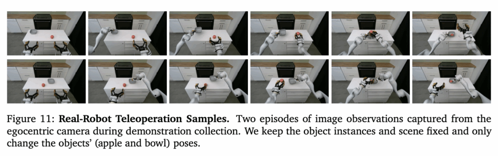실험 세팅은 일반적인 Imitation Learning 파이프라인을 따라서 진행했다고 합니다. Egocentric 카메라로 D455를 사용하는 양팔 로봇을 통해 table top manipulation demo를 수집해 해당 데이터를 바탕으로 학습했습니다. 데이터 수집을 위해서는 Meta Quest 2 controller를 사용했다고 하네요. Task는 아래와 같이랜덤한 위치에 존재하는 bowl 과 appple을 기준으로 각 손으로 apple, bowl을 잡아 사과를 먼저 공중에서 bowl에 담고 사과가 담긴 bowl을 내려놓는 task입니다. 100개의 human teleoperation을 수집해 Diffusion policy policy optimization (DPPO)를 통해서 학습했다고 합니다.