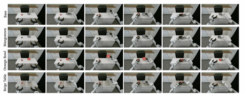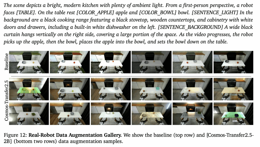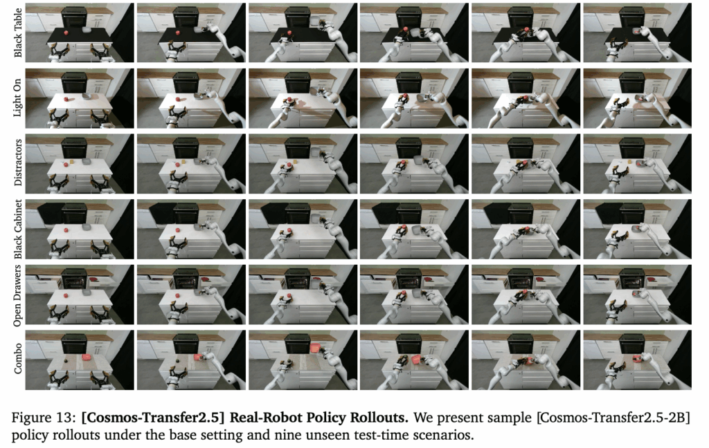 Cosmos-Transfer는 robot policy를 위한 데이터 엔진으로 활용할 수 있는데, 이를 노리고 나온만큼 배경과 실제 로봇 데이터 augmentation strategy를 공유했습니다. 핵심은 과연 cosmos transfer 2.5가 policy의 unseen scenario에서의 일반화를 가능하게 하는 data generator로써의 역할을 수행할 수 있는가? 입니다.