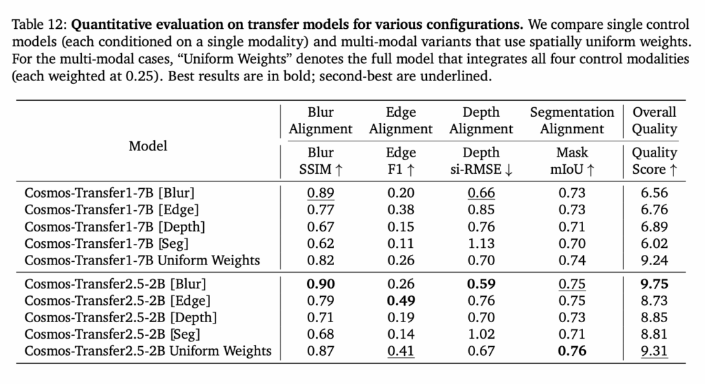 학습은 Cosmos-Trasnfer 2.5 -2B모델을 베이스로 edge, blur, depth, segmentation의 각 modality에 해당하는 control branch를 10만 iteration으로 각각 독립적으로 진행했다고 합니다. 이렇게 따로 학습시켜서 각 전문성을 가지고 통합하는 방식이 많이 쓰이는 것 같습니다. 하이퍼파라미터의 경우, 모델 간의 일관성을 보장하기 위해 Cosmos-Predict2.5-2B에서 사용된 것과 동일한 설정을 채택했습니다.