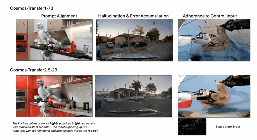 정리하자면 cosmos predict 2.5를 가져다가 video2video 능력을 베이스로 사용하면서 controlNet 스타일로 control branch만 각 condition modality별로 학습을 돌려서 잘 섞어준 느낌입니다. 그 결과 아래와 같이 기존 cosmos-transfer 7B 모델보다 훨씬 일관성있고 hallucination이 적을 뿐 만 아니라 프롬프트가 잘 반영된 고품질의 영상을 transfer 할 수 있었다고 합니다. 결국 cosmos-predict가 좋아져서 같이 좋아졌다고 볼 수 있을 것 같습니다.