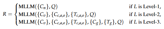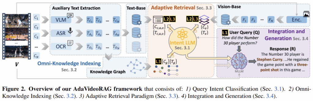 Video RAG에서 영상 데이터에서 생성모델에 입력할 정보를 추출하는데 있어 가장 변수가 되는 요인은 질의의 수준이다. 예를 들어, “5초에 나오는 공의 색깔은 무엇입니까?“와 같은 질의는 영상에 대한 맥락적 이해를 요구하지 않으나, “영상에서 소녀는 왜 공을 던지고자 했습니까?“와 같은 질의는 영상에 등장인물의 행위 의도를 파악해야하는 등 더욱 깊은 수준의 이해를 요구한다. 이처럼, 질의에 대해 올바르게 답변을 생성하기 위하여 질의 의도 분류는 필수적이다. 논문에서는 질의의 수준을 3단계로 나누는데, Level1은 직관적 질의로 video안의 특정 지식에 대한 것이다. Level2는 쉬운 질의로 한단계의 공간/시간적 추론이 필요한 것인데, 예를 들어 “여자가 비오는 시점에 울었나요?”와 같은 질문은 단순히 “여자가 울었다”는 사실이 아닌 “비 온 시점”에 “여자가 울었다”를 확인하기 때문에 시간적 추론이 필요한 질문이다. 마지막으로 Level3는 어려운 질의로 전체 혹은 긴 맥락 파악이 필요한 질문이다. 예를 들어 “영화가 전하는 교훈은 무엇인가요?”와 같은 질문이 이에 속하며, 영화의 내용 전체를 이해해야 답변할 수 있다. - 비디오 지식 인덱싱, Omni-Knowledge Indexing