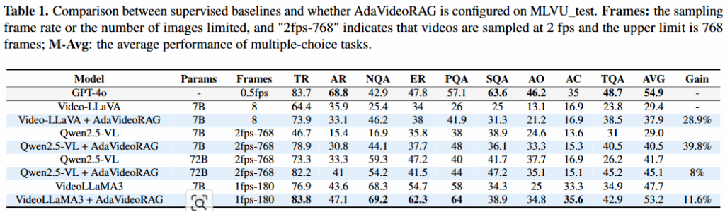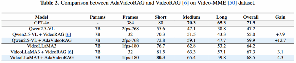 위의 Table1, 2는 기존 벤치마크에 대한 적용실험 결과이다. Video-LLaVA, Qwen2.5-VL, VideoLLaMA3에 대해 실험이 진행되었으며, AdaVideoRAG를 적용했을 때 open source로 상업용 모델인 GPT-4o 성능에 가깝게 도달한 성과를 얻었다. 또한 Video-MME에서는 기존 RAG 기법과 성능을 비교할 수 있었는데, 실험 결과 제안 방법론이 더욱 성능개선이 있었다는 점에서 유의미 하다. 즉, 현재의 RAG 기법 중 open source 모델로 상업용 모델과 가장 가까운 성능을 낼 수 있는 방법이라는 점에서 의미가 있다.