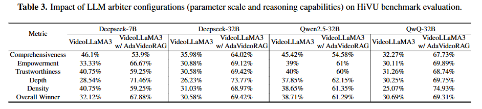 Table3은 HiVU에 대한 평가 결과이다. 제시한 다양한 지표에 대해 평가를 수행했는데, 채점 모델 기준(표의 가장 상단) 7B 모델보다 32B 모델의 개선정도가 우수함을 통해 채점 모델이 우수할수록 명확하게 제안된 AdaVideoRAG가 우수함을 확인할 수 있다.