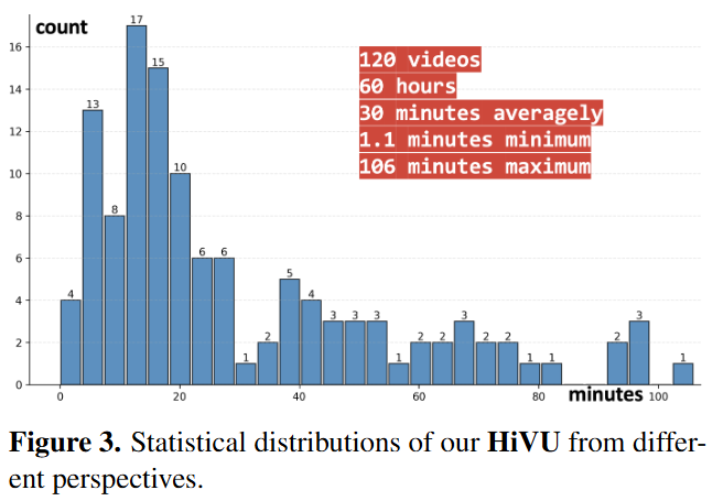 논문에서는 계층적 질의응답의 중요성을 언급하고 해결하였다. 이를 검증하기에 기존 데이터셋은 영상이 길이가 짧고 질의가 단순하여 평가가 어렵기 때문에 새로운 벤치마크인 HiVU를 제시하였다. HiVU는 총 60시간에 해당하는 120개의 비디오로 구성되었으며 비디오의 평균 길이는 30분인 Long-video 데이터셋이다. 3가지 다양한 도메인-강의나 다큐멘터리같은 지식-교육, 뉴스와 같은 정보, 엔터테이먼트-에 대한 비디오를 광범위하게 수집하였으며, 제안한것처럼 3단계의 질의응답으로 구성되었다. 뿐 만 아니라 응답의 평가를 위해 5가지로 나누어 평가하도록 구성되었는데 기존에 활용되던 LLM 기반의 평가방식을 구체화한 것으로 평가 지표 5가지: Comprehensiveness (질문을 얼마나 온전히 커버하는가) Empowerment (사용자에게 의미 있는 통찰을 주는가) Trustworthiness (사실성, 신뢰도) Depth (표면적 설명 vs 심층적 분석) Density (불필요한 말 없이 핵심만 담았는가)에 대해 면밀하게 평가하도록 벤치마크를 구성했다. (기존 LLM 기반의 평가방식은 두 모델의 응답을 LLM이 비교 후 승자를 결정하는 Win-Rate 방식으로 LLM-as-a-Judge 등으로 기존 방법에서 다루어지는 지표이다.) 다만 각 평가를 위한 프롬프트는 공개되지 않았다.
