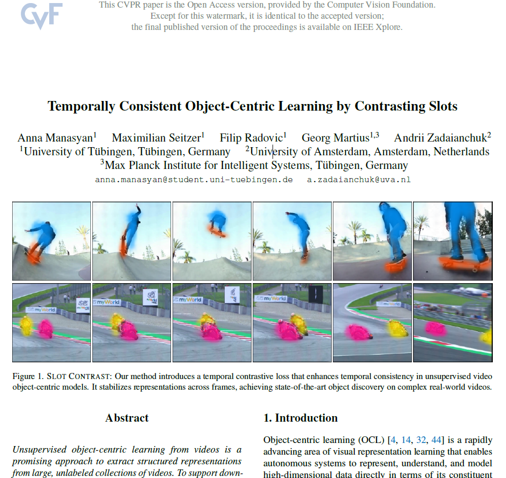 안녕하세요, 허재연입니다. 오늘 리뷰할 논문은 CVPR 2025에서 Oral presentation으로 선정됐던 논문으로, video data를 활용한 self-supervised object centric learning 기법을 다룹니다. 제 개인 연구에서 어떻게 하면 object query들이 temporal consistency를 갖게 할 수 있을까 고민하면서 읽어보았습니다. 그럼 바로 리뷰 시작하겠습니다.