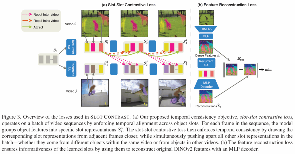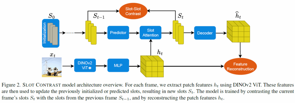 기본적으로 제안 방법론은 기존의 reconstruction 기반 object-centric framework(SAVi, VideoSAUR)를 확장해 학습 과정에서 contrastive loss를 추가한 것이라고 합니다. 이쪽에 집중하여 살펴보겠습니다. 전반적인 프레임워크 개요는 아래 그림 2와 같습니다.