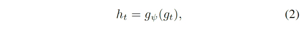이 때 백본이 학습되지 않고 고정되기에 temporal consistent object discovery task에 알맞게 변환시키기 위해 다음과 같이 한번 MLP({g}_{ψ})를 태워 encoder feature {t}_{t}를 만듭니다.
