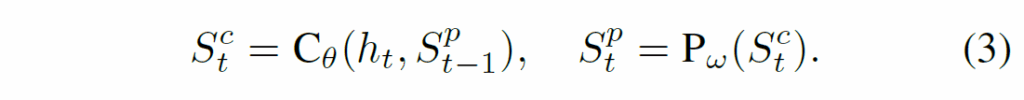 이제 t frame의 slot 집합인 {S}_{t}를 만드는데, 이때 Figure 2와 같이 이전 step의 slot집합인 {S-1}_{t}을 사용합니다. {S}_{t-1}를 predictor에 통과시킨 후, visual feature {h}_{t}와 Slot Attention을 수행하죠. 아래 수식 (3)에서 {P}_{ω}는 predictor module, {C}_{θ}는 grouping module(Slot Attention 수행부)입니다. 논문에서는 이들을 합쳐서 Recurrent Slot Attention Module이라 합니다.