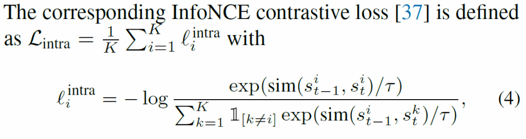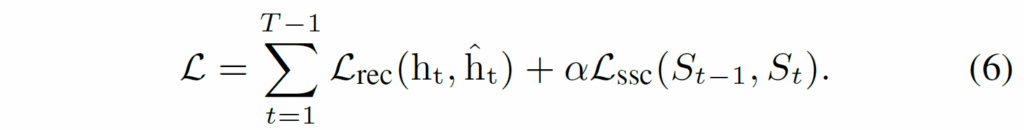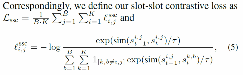 기본적으로 InfoNCE loss를 사용하고, (t-1, t) timestep의 동일 슬롯을 positive로, 나머지는 negative pairs로 사용합니다. 인접 프레임에서 동일한 slot이 동일한 object에 잘 할당되기를 기대하고, negative pair끼리는 멀어지도록 유도하여 분별력을 가지게 하였습니다. 유사도(sim)은 항상 사용되는 cos 유사도입니다. 타우는 temperature parameter입니다.