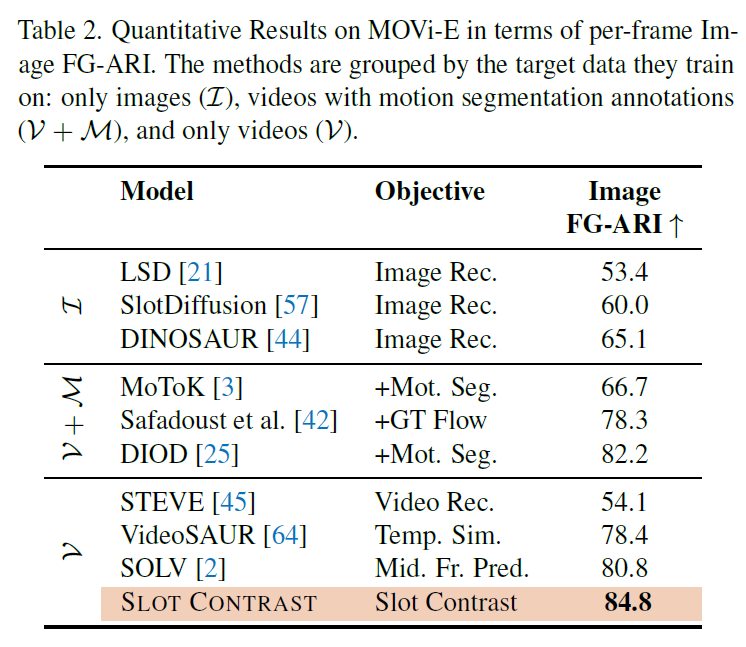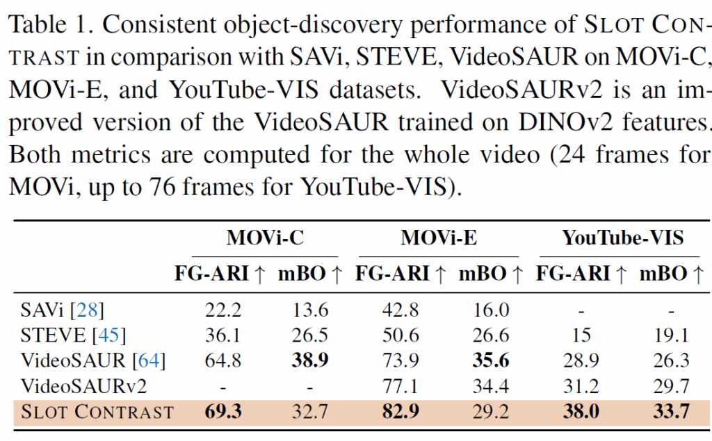 - 우리는 SlotContrast가 representation의 시간적 일관성을 향상시키는 동시에, object discovery task에서도 SOTA를 달성하여 motion cue를 사용하는 weakly supervised learning 모델들보다 뛰어난 성능을 보임을 입증하였다.
