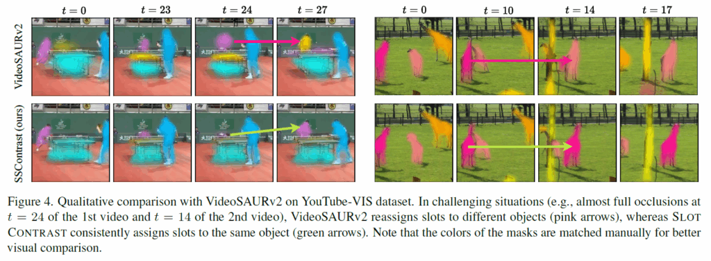 정성적 시각화 결과 하나 보고 리뷰 마무리하도록 하겠습니다. YouTube-VIS dataset에서 제안하는 방법론과 VideoSAURv2를 비교하였습니다. 완전한 occlusion이 발생하는 어려운 상황에서 VideoSAURv2는 다른 물체에 slot을 재할당 하는데(분홍 화살표), SlotContrast는 동일한 물체에 일관적으로 slot을 할당하는 것을 확인할 수 있습니다(초록 화살표).