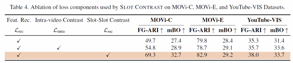 이어서 Table2에는 프레임별 장면 분해를 측정하였습니다. 저자들은 temporal consistency loss에 contrastive learning을 도입이 장면 분해에 도움이 되는 것을 확인하였습니다. 해당 loss가 프레임 전반에 걸쳐 물체에 대해 일관된 feature representation을 학습할 수 있도록 유도하여 개별 frame에서의 object discovery에 큰 도움이 되었다고 합니다.