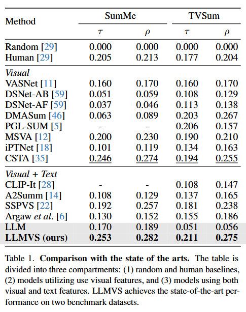 - 먼저 저자들은 비디오 요약에서 가장 널리 쓰이는 벤치마크 데이터셋인 SumMe와 TVSum을 사용하여 다른 SOTA 요약모델들과의 성능을 비교했습니다.