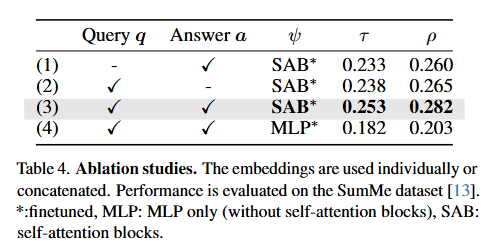 - 다음으로 LLMVS에서 가장 중요한 구성요소가 무엇인지 살펴보는 ablation studies으로 저자들이 제안한 방법에서 출력임베딩인 q,a와 3단계의 self-attention 블록ψ의 효과를 검증했다.
