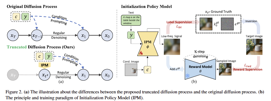 저자는 이러한 통찰을 기반으로 Initialization Policy Model;IPM이라는 기법을 제시합니다. IPM은 diffusion process의 초기 단계의 무작위성에 의존하는 것이 아니라 주어진 전경 영상 y와 텍스트 프롬프트 y만을 바탕으로 intermediate state x_{t^s} 를 직접 예측하고 이를 기반으로 Truncated Diffusion Process를 수행합니다.