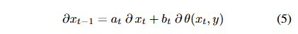 최종 reward로부터 생성된 gradient는 연쇄 법칙에 따라 back-propagation이 될 수 있으며, 이웃된 timestep 간의 gradient는 아래와 같이 표현됩니다.