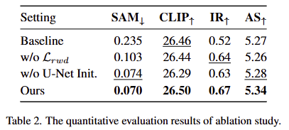 Ablation Study for U-Net Initialization. tab 2에서 보이는 바와 같이 사전학습된 U-Net으로 IPM를 초기화함으로써, 모델의 텍스트 제어 능력이 강화됨을 보입니다.