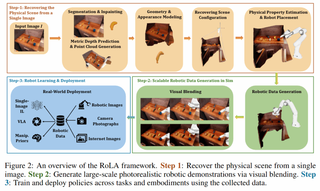 이러한 틀을 가지고 저자들은 특별한 하드웨어나 추가 정보 없이도 아무 이미지나 로봇 학습에 활용가능한 시뮬레이션 환경으로 변환하는 RoLA를 제안했습니다. RoLA(Robot Learning from Any Images)는 입력 이미지로부터 물리적으로 상호작용 가능한 scene을 자동으로 복원한 뒤, 그 안에서 photorealistic한 visuomotor policy를 위한 데이터를 대량 생성하여 정책 학습에 활용하는 end to end 파이프라인입니다. 해당 프레임워크는 큰 틀에서는 전형적인 real to sim to real 방법을 따라갑니다. 먼저 단일 이미지에서 객체와 배경의 3D 기하를 추정하고, 물리 속성까지 고려한 장면을 복원하여 시뮬레이션 asset으로 변환 후 카메라의 포즈를 추정하고, 로봇을 배치합니다. 이후에는 복원된 scene을 시뮬레이터에 불러와 다양한 로봇 task에 대한 대규모 시뮬레이션 데이터를 수집합니다. 마지막으로는 시뮬레이터에서 얻은 영상들을 현실 배경과 합성하는 visual blending 기법으로 로봇 데모 영상을 만들고, 이를 사용해 정책을 학습시킨 뒤 실세계 로봇에 이식해줍니다. 이 모든 과정이 사람의 개입 없이 완전 자동화되어 있으며, 어떠한 이미지라도 입력으로 받아들일 수 있는 범용성을 가지는 것이 장점이라고 합니다. 이러한 단일 자동화된 이미지 기반의 범용적인 파이프라인을 통해 저자들은 방대한 수의 인터넷 이미지를 로봇 학습에 활용하는 길을 열고 scalable robot learning에 힘쓰려는 것으로 보입니다.