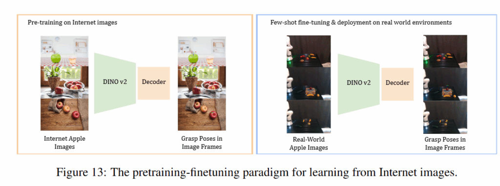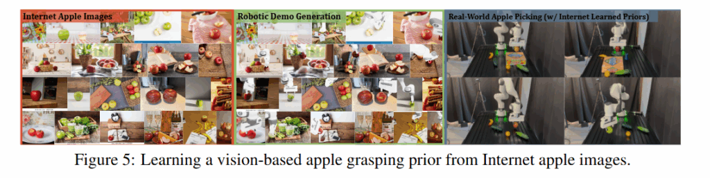 인터넷 이미지만을 가지고도 학습이 가능한가?에 대해서도 평가를 진행했는데, 다음과 같이 다양한 이미지 데이터로부터 사과를 집는 action을 학습해 아래 table4와 같은 결과를 보여주었습니다. 앞서 언급했던 grasping pose 추론 모듈을 활용했을 때 훨씬 더 성능이 좋아졌다고 합니다.