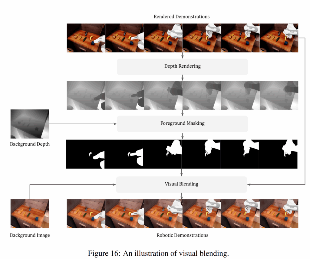 데이터를 취득하는 과정은 특별한게 없습니다. 만들어진 시뮬레이션 환경 내에서 직접 space mouse나 키보드로 teleoperation을 진행하거나, CuRobo를 통한 motion planning을 진행한다고 합니다. Motion planning의 경우 위 figure 13과 같이 사진으로 부터 DINOv2 인코더 feature를 통해 파지점의 6d pose를 직접 예측하는 디코더 head를 학습시킨 신경망을 학습시켜 활용합니다. Pretrained manipulation policy를 활용한다고 하기도 하네요. 데이터 취득 시에는 background와 object를 더 사실적으로 합성하는 visual blending이라는 기법이 등장하는데, 이건 아래와 같이 전에 리뷰한 Re3Sim에서의 visual blending과 유사하게 z-buffer를 활용해서 occlusion을 잘 반영하는 정도라고 생각하시면 될 것 같습니다. 시뮬레이션 데이터는 {로봇 액션, RGB, Depth}쌍을 얻어준다고 합니다. 취득한 데이터로 VLA들을 학습시키면 파이프라인의 완성입니다.