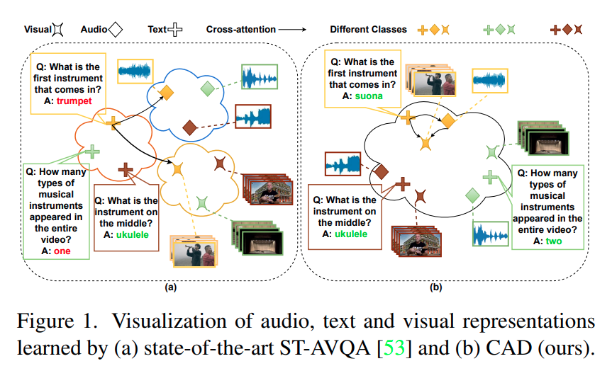 예를들어 그림 1에서 노란색 클래스에서 악기의 공간적 위치는 오디오와 비주얼 입력을 통해 결정할 수 있지만, ‘어느 것이 먼저 나오냐?’ 에 답하려면 악기의 소리를 동시에 듣고 비주얼 입력에서 그것을 동시에 보아야 합니다. 이 단계에서 소리와 악기의 시각적 등장 사이에 시간적 비정렬이 존재하면 학습을 저해할 수 있습니다. 또한 의미 수준에서는 악기의 소리와 외형을 악기의 라벨과 연결지어야 합니다. 다시 그림 1 (a) 에서 최신 방법인 ST-AVQA 에서는 오답인 트럼펫을 예측하는 방면, 저자의 방법은 suona 를 예측하는 것을 보여줍니다. 부연 설명으로는 ST-AVQA에서는 정답을 맞추기 위한 의미 수준의 학습이 없지만 저자의 방법론은 연주되었다 (played) 가 아니라 등장했다 (appeared) 에 관한 의미 수준의 학습이 잘 되어 있다고 주장하는 것 같습니다. figure만 보면 ST-AVQA 는 audio, visual, text 에 관한 각 모달리티가 서로 다른 클래스에 대해 묶여있지만, 저자는 동일 클래스에 대한 모든 모달리티의 정보가 통합된 공간에 정렬되어 있어서 AV 정보 신호의 균형을 맞출 수 있음을 알 수 있습니다.