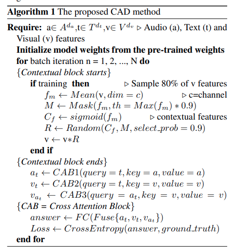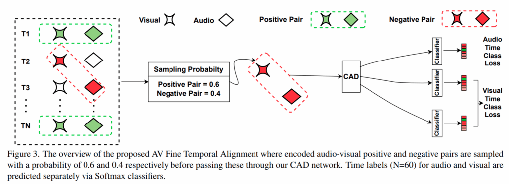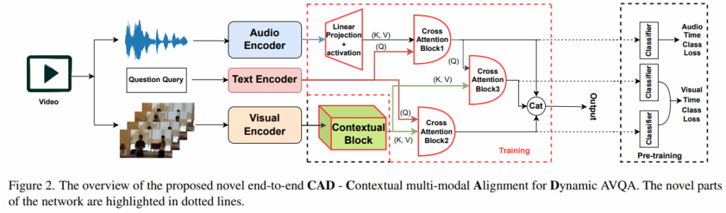 저자는 위의 문제점을 해결하기 위해 end to end Contextual Multi-modal Alignment (CAD) 네트워크를 제안합니다. 해당 네트워크는 1) 공간 수준에서 오디오와 비주얼 정보의 정렬을 보장하는 파라미터가 없는 확률적(Contextual) 블록을 도입하고, 2) 자기지도 설정에서 시간 수준의 동적인 오디오-비주얼 정렬을 위한 사전학습 기법을 제안, 3) 의미 수준에서 오디오와 비주얼 정보를 균형있게 만들기 위한 cross-attention 매커니즘을 도입함으로 위의 문제점들을 해결했다고 합니다. 또한 저자가 제안한 방법들이 추가적인 복잡도의 증가 없이 기존 방법들에 결합될 수 있다고 합니다.