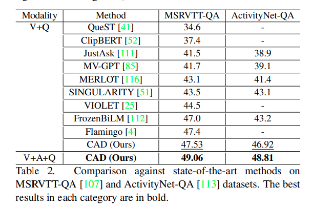 AVQA task만 다루는 것이 아닌 MSRVTT-QA 나 ActivityNet-QA 에서도 SOTA 방법론들과 비교하여 더 나은 성능을 보여줍니다. 기존의 VQA 방법론들은 MSRVTT-QA 데이터셋이나 ActivityNet-QA의 오디오 정보는 사용하지 않았지만 저자는 해당 audio 정보까지 사용하면 성능이 더 오르는 것을 실험적으로 보여줍니다.