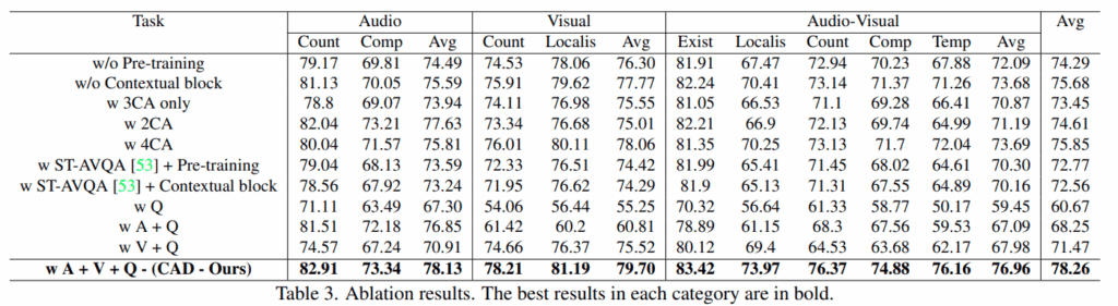 최근에 나온 성능들이랑 비교해도 낮지않은 성능이지만, 사용한 audio 백본이나 video 백본, 또는 사전학습에서 사용된 데이터셋등을 생각하면 실제 모델의 구조적 측면에서 pair comparison이 가능할까 싶기는 합니다. 물론 기존 ST-AVQA 방법론에 저자의 Pre-training 이나 contextual block 등을 적용했을때 성능이 오르는 것으로 어느정도 그 성능을 입증한 것 같습니다.