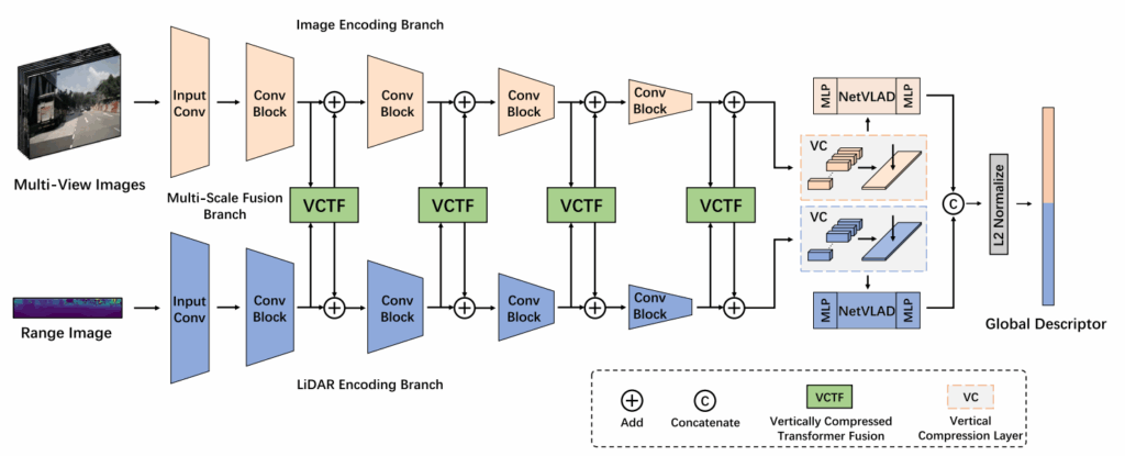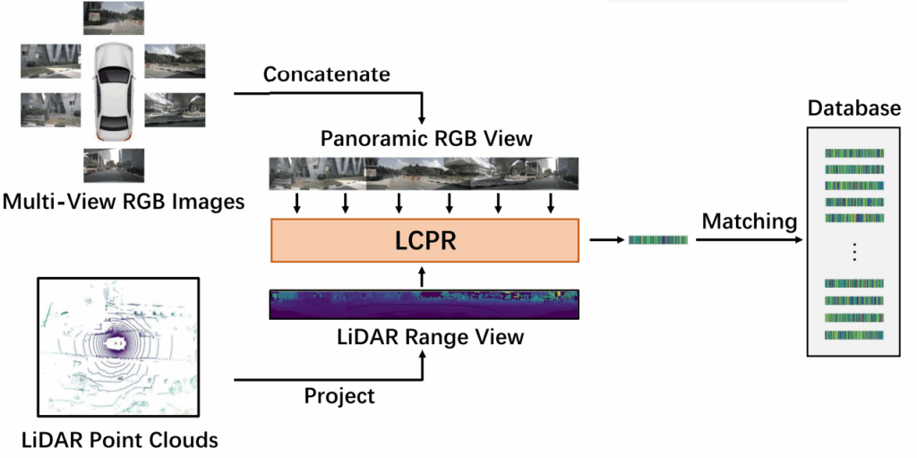 이에 저자는 Multi-view camera 이미지를 전부 엮어서 Panoramic view를 만들고, 이를 LiDAR와 결합하는 LCPR 네트워크를 제안합니다. 특히 여기서 주목할 점은 Vertically Compressed Transformer Fusion (VCTF) 모듈입니다. 도시 환경에서는 수직(Height) 정보보다 수평(Width) 정보가 중요하기 때문에, 수직 방향으로 feature 를 압축해서 연산량을 줄이면서도 Global Context를 잡겠다는 전략입니다. 대략적인 흐름도는 아래와 같으며, 자세한 사항은 method 에서 설명 진행하겠습니다.