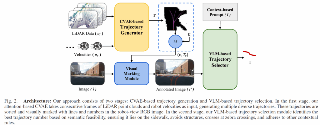 이를 바탕으로 저자들은 VL-TGS라는 새로운 프레임워크를 제안합니다. 먼저 LiDAR 데이터를 이용해 물리적으로 주행 가능한 여러 개의 후보 경로를 생성합니다 (CVAE 활용). 그리고 이렇게 생성된 경로들을 카메라 화면 위에 시각적으로 표시한 뒤, VLM에게 사람이라면 어떻게 이동할 것 같은지를 모델에게 물어보도록 해 가장 적절한 경로를 선택하게 합니다. 구체적인 방법론은 아래에서 다뤄보겠습니다.