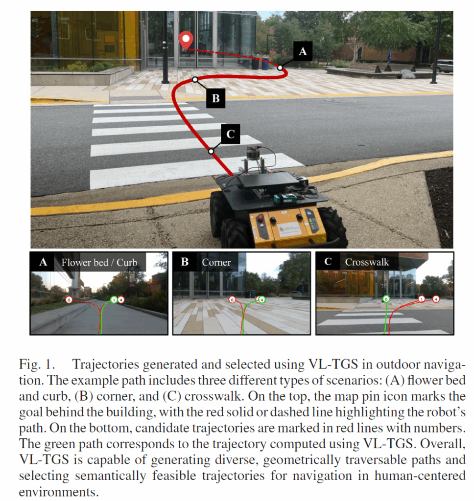 반면, VLM은 시각 정보를 통해 “저것은 건물(장애물)이니 돌아가야 한다”거나 “사람이 있으니 피해야 한다”는 맥락을 이해합니다. 따라서 그림 5(b)처럼 건물을 우회하는, 더 안전하고 사람다운 경로를 선택한다고 합니다. 이는 VLM이 경로를 선택하는 방법론에서 적합하다고 볼 수 있겠네요.