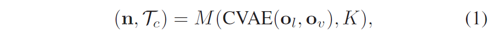 경로 집합 \mathcal{T}는 연관된 confidence를 가진 경로들을 생성하기 위해 CVAE에 의해 생성됩니다. 구체적으로, CVAE 디코더를 위한 조건 값을 계산하기 위해 각 관측값 {o_l, o_v}을 encoder에 입력으로 합니다(c = f_e(o_l, o_v)). 그 후 임베딩 벡터는 임의의 신경망 f_z(\cdot)를 통해 z = f_z(c)로 계산이 된다고 합니다.