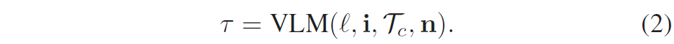 이제 준비된 이미지(i), 경로 정보(n, \mathcal{T}_c), 그리고 언어 지시어(l)를 VLM에게 입력으로 줍니다. VLM은 이 정보를 바탕으로 주행 가능성, 사회적 규범(Social Compliance), 목표까지의 거리 등을 종합적으로 고려하여 최적의 경로 \tau를 선택합니다. 이는 수식 앞서 보여드렸던 수식 (2)로 표현됩니다.